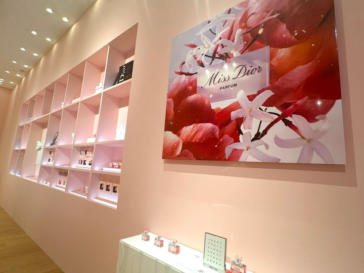 展示が終わると、新作の「ミスディオール パルファン」をはじめとするフレグランス全製品やメイクアップ、スキンケア製品がずらりと並んでいます。