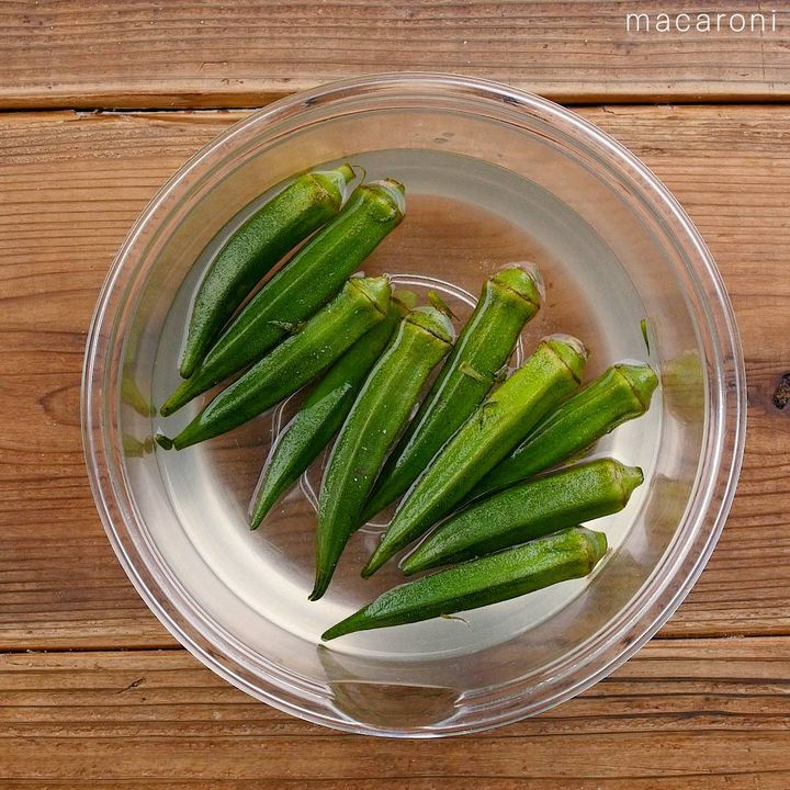 オクラはレンジ加熱の際、破裂の恐れがあるので、爪楊枝などで数カ所穴を開けてから加熱してください。