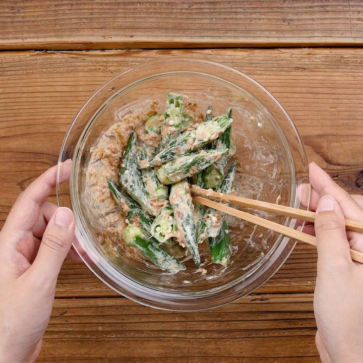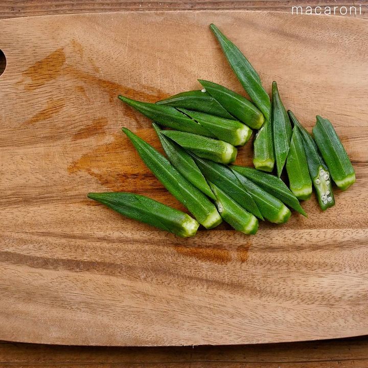 こちらのレシピでは大きめに切っていますが、オクラは大きく切ると食感がよく、小さく切ると粘り気が強くなります。お好みの大きさに切ってお作りください。