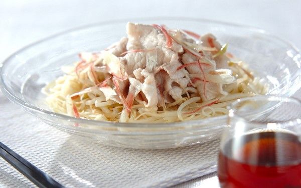 冷たいそうめんに冷しゃぶ、モヤシ、刻んだミョウガをたっぷりトッピング。ツルツルの麺とシャキシャキもやしの食感が楽しく、さっぱりと食べられます。麺つゆにすりおろしたニンニクを足すと、ひと味違う旨ダレになるのでお試しを。
