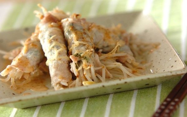 モヤシと大葉を豚肉でくるっと巻いたら、レンジでチン。お好みでポン酢やゴマドレをかけて召し上がれ。大葉の爽やかな風味がアクセントになり、あっさり味で食欲のない日でも食べやすいです。