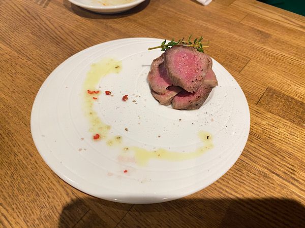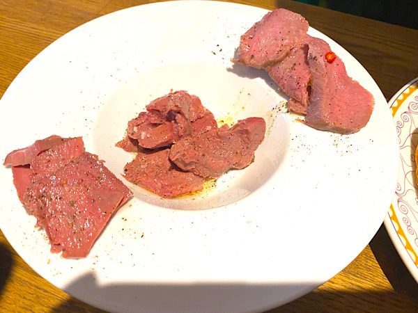 低温調理の牛カルパッチョ盛り合わせ 右から牛タン、レバー、ハツ。どれも臭みがなくて新鮮です。特にレバーが気に入りました。