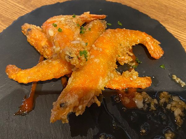 病みつきガーリックシュリンプ 頭からガジガジいっちゃってください。不思議と殻が口の中に残らず食べ切れます。