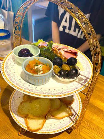 まずはTapasが出てきましたが、大盛り上がり!2段になっているアフタヌーンティー形式です。持ち手がGoldで可愛い!