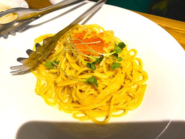 ウニとイクラのクリームパスタ これ絶品です。濃厚なウニソースにイクラ。間違いない組み合わせです。もう一皿頼んでもよかったかも。