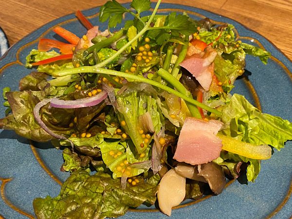 カモとキノコのクレソンサラダ キノコの茹で具合もちょうどいいんです。ドレッシングのマスタードがカモに合います。
