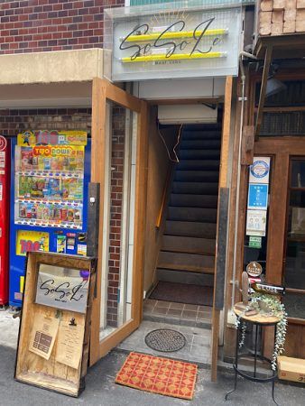 外からはちょっと分かりづらいかな?昼間だったので余計に目立ちませんでしたが、夜は多分ライティングされていて分かりやすいかも?! ビルの隙間にある小さな階段を上がります。