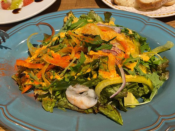 海老とアボガドのコブサラダ。メキシカンテイストなコブドレッシングが生野菜にピッタリ。