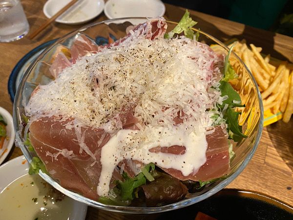 生ハムとサラミの盛り合わせ これはサラダですが、大きなカクテルグラスのような器に入ってきて大盛り上がりです。美しい器はお料理の味をアップさせると思います。