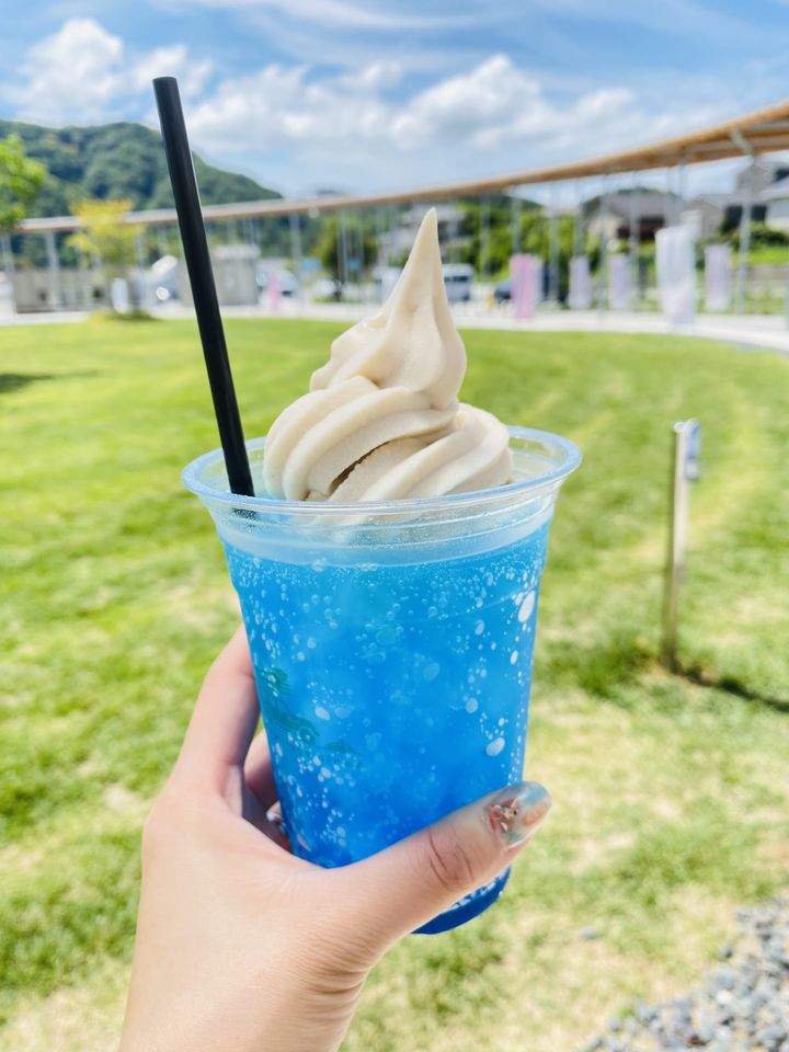 ブルーキュラソーフロートだったっけな??ソフトクリームはオーツミルクで作ってるみたいです☆
