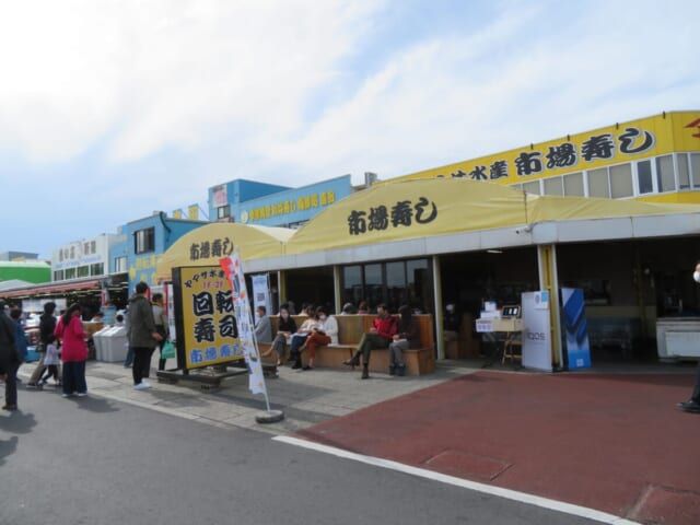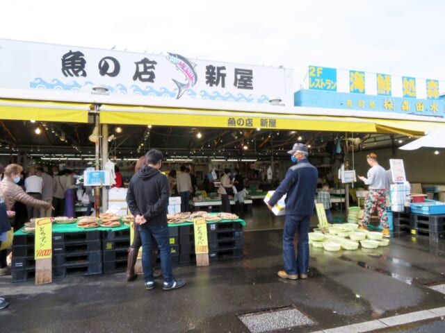 食べ歩きは手軽に海の幸を味わえますが、市場の周辺には約10軒の飲食店があります。刺身や海鮮丼、寿司など、多様な料理を落ち着いて堪能することができます。