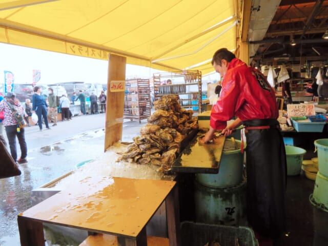 中でも大人気なのが生ガキ。目の前で手際よく殻が開いてくれます。ツルっとした食感とともに、濃厚な磯の香りが口いっぱいに広がるようです。価格もリーズナブルなので、知らず知らずの内に食べる数が増え、殻の山づくりに貢献してしまうようです。