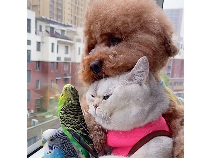 犬、猫、インコの珍しい組み合わせ!