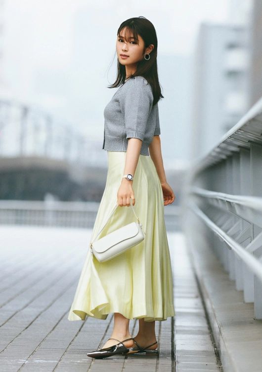 夏の日差しのようにクリアなイエローを、レディなフレアスカートで取り入れて。ラメニットの短丈カーデを相棒に、メリハリを効かせた着こなしで、心弾むお仕事服に。
