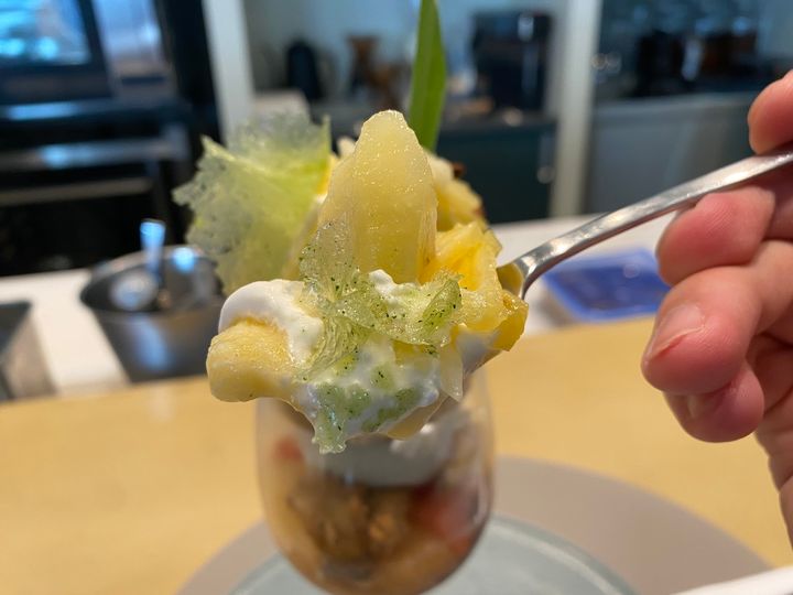「パイナップル/国産グレープフルーツ/スパイスのパフェ」は、見た目がアートのように華やかになっていて、食べるのがもったいないと思ってしまうほど。名前の通りパイナップルやグレープフルーツがふんだんに使われた夏らしいさわやかな仕上がりになっています。フルーツはコンポートやジュレなどさまざまなアレンジがされているため、食感や味わいの変化を楽しめるのがポイントです。