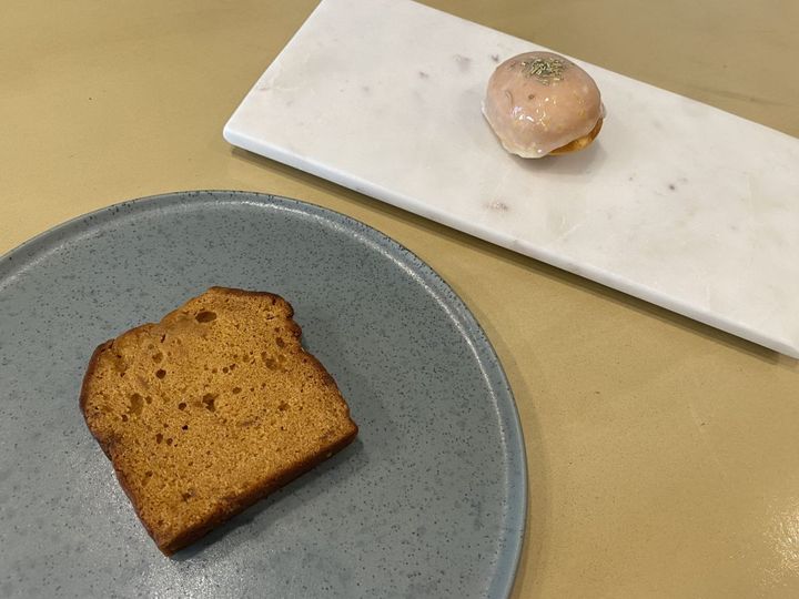 魅力的なラインナップが揃うなか、今回は取材時に提供されていたパフェメニュー「パイナップル/国産グレープフルーツ/スパイスのパフェ」2500円と焼き菓子の「キャラメルジンジャーオレンジ」394円(写真左)、「神の島レモンケーキ」410円(写真右)をセレクトしました。