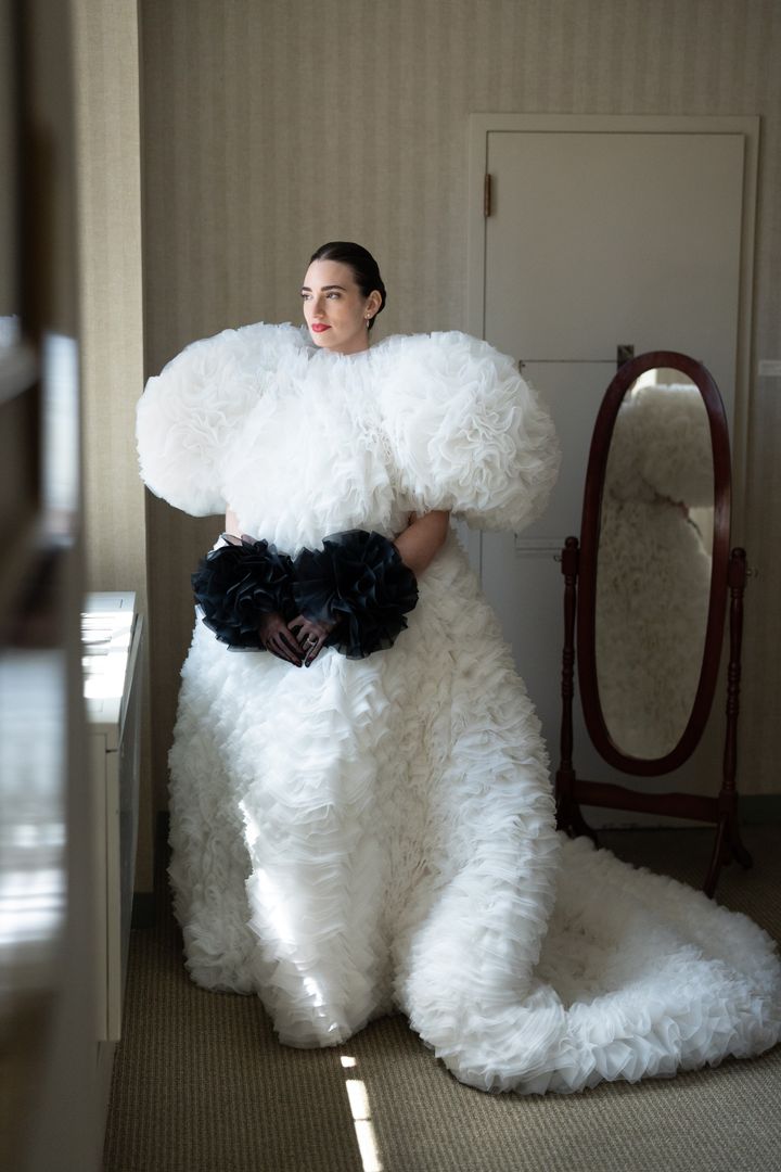白いフリルに覆われたドレスは、トモ コイズミTOMO KOIZUMI)×エミリオ・プッチ(EMILIO PUCCI)の2021年春夏カプセルコレクションからの1着。背中にジッパーのあるトップ、フルレングスのスカート、ケープの3つのピースで構成されている。ドレスが決まると、今度は結婚式で実際に着用できるルックに仕立て直さなければならなかった。「手を出したくない」ことを理由に何人かの仕立て屋に断られた末、やっと出会ったのがセレブたちも贔屓のドレスメーカー、タティアナだ。一から作り直す、ジャンプスーツにする、ボレロジャケットにする。メクラーが持ってきた1枚を一種のチャレンジとして受けて立ったタティアナとの間にあらゆるアイデアが飛び交ったが、ドレスの写真を見返す度に、易々と手を加えることはできないと思ったという。「このままでいい。でも、より一層豪華にするためにトレーンを付けようということになりました。そこで登場したのがケープです」