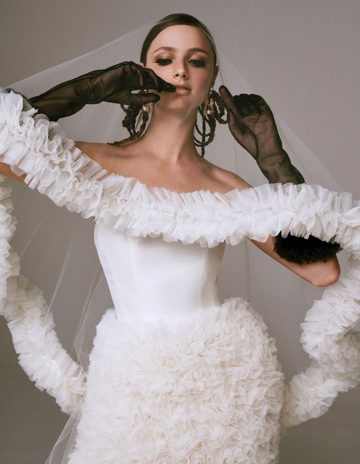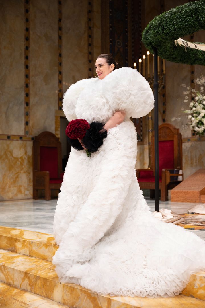ドレスもさることながら、2人が式場として選んだエマニュエル寺院も、長いレッドカーペットが敷かれていて絢爛さに欠けていなかった。そのため、メクラーはブライダルルックを完成させるアクセサリー選びに頭を悩ませた。インスピレーションを求めた彼女が目を向けたのが、トモ コイズミのランウェイ。「どのガウンにも、いつも対照的な色のカフスみたいなものを合わせていることに気づいたんです」と過去のショーをチェックしたメクラーは言う。「私のドレスには、ブラックがとてもよく映えるのではと話していました」。そうしてアクセサリーはブラックのフリルカフスに落ち着き、ヘアは低い位置でまとめたシンプルなお団子、メイクはブーケとレッドカーペットとマッチした赤リップがポイントのミニマルルックに仕上げた。