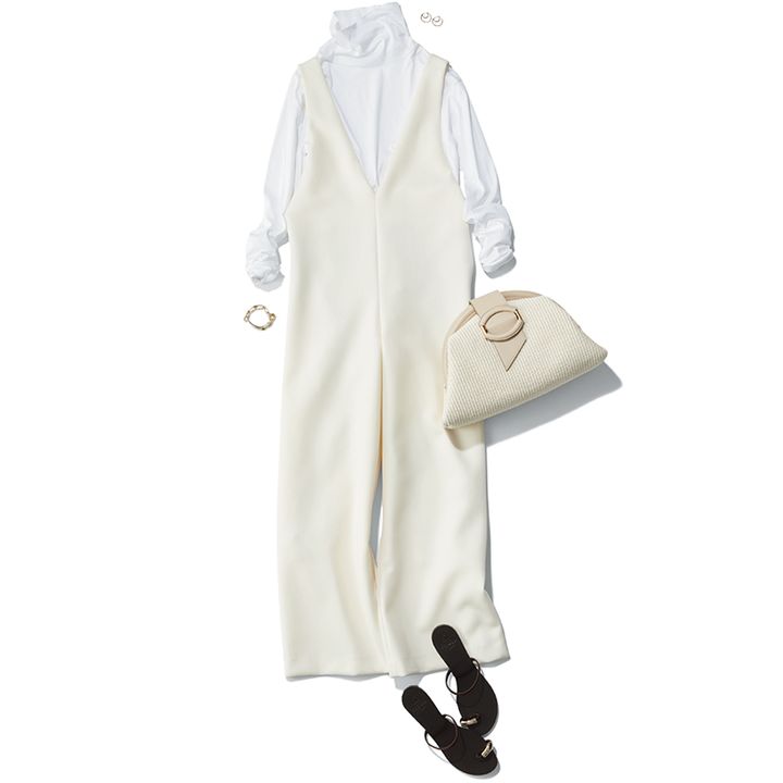 白サロペットのオールホワイトコーデは、華やかさを作る鉄板!靴やバッグなど、小物のどこかに締め色を使って仕上げて。