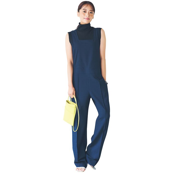 汎用性の高いネイビーサロペットにインナーが黒だと重たくなってしまいそうですが、透け素材・ノースリの肌見せを計算すれば最旬バランスが手に入ります。
