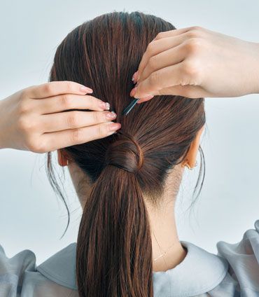 表面をブラシで整えて襟足の少し上で1つ結びにする。毛束をクルクル巻きつけてゴムを隠し、毛先をピン留め。