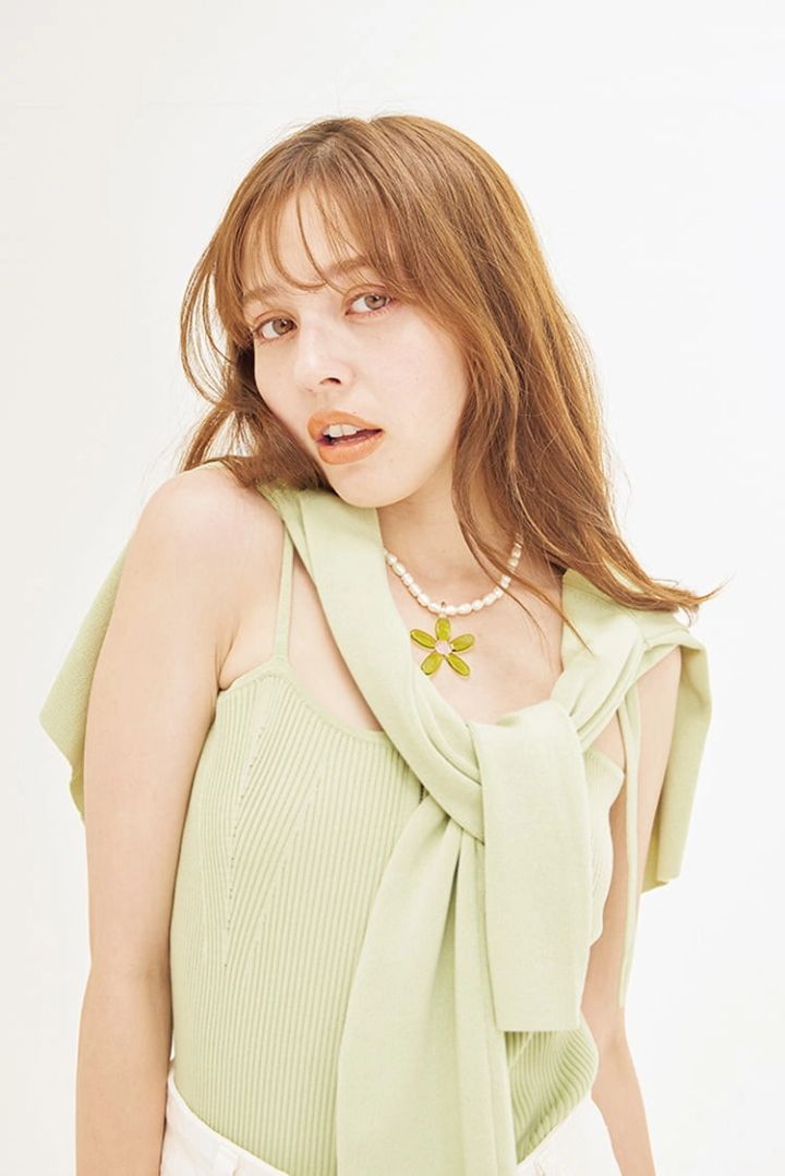 ピスタチオカーディガンとニットキャミソールのセット 7,920円/archives 白デニムパンツ 6,990円/MANGO ネックレス 16,500円/NINFA handmade(ROSE BUD ルミネエスト新宿店)