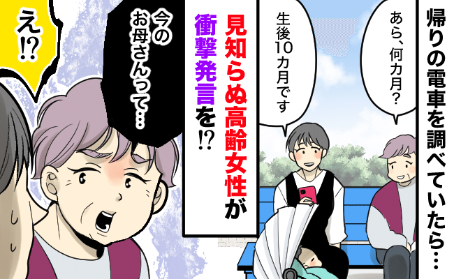 ある日、生後10カ月の長男を連れて、ベビーカーでおでかけをしたときのことです。おでかけの最中に、長男がベビーカーで寝てしまったので、帰りの電車の時刻表をスマホで調べていたら、隣に座った高齢の女性からまさかの発言が……。