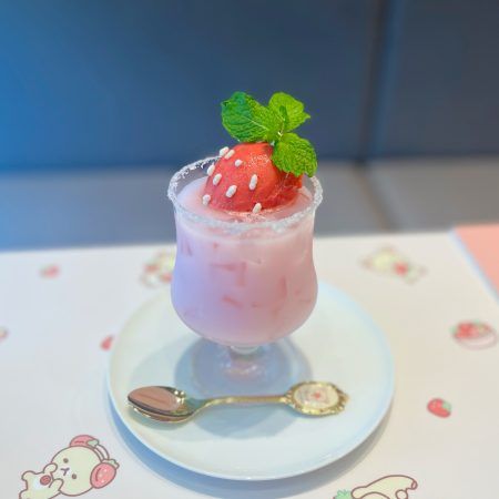 そのドリンクの一つ「コリラックマのいちごフロート」は、フランボワーズシャーベットでできた苺がのっている桃風味のドリンクです。