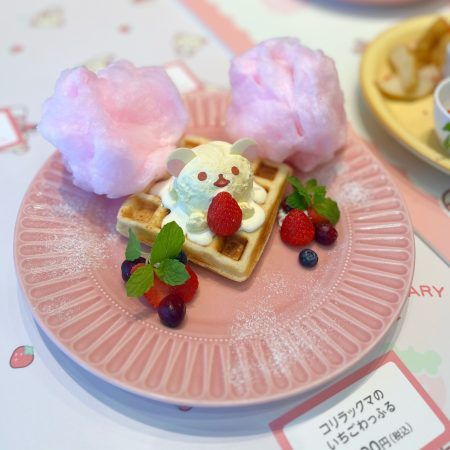 「コリラックマのいちごわっふる」(1590円)には、大きなピンクの綿あめがのっています。