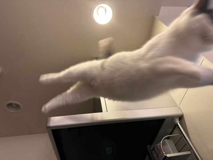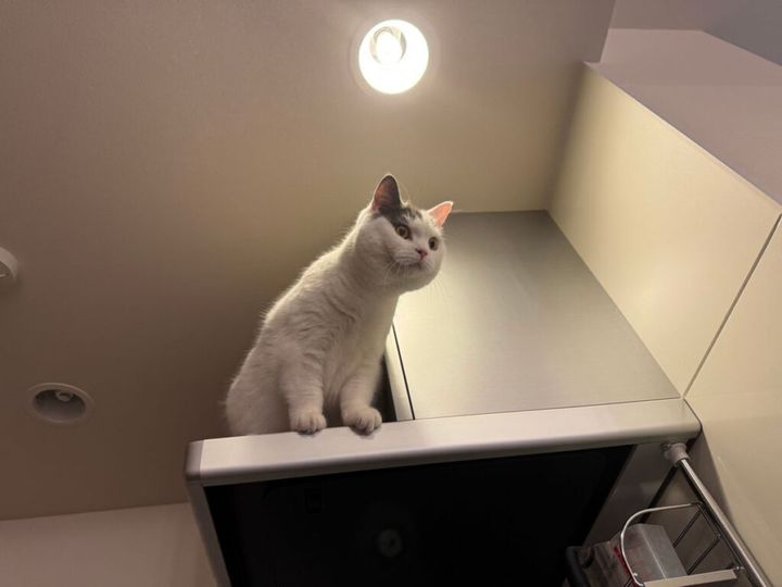 ボクはねこだから高いところが大好き。最近覚えたのは、キッチンコンロの上。ここからの眺め、最高なんだよー!
