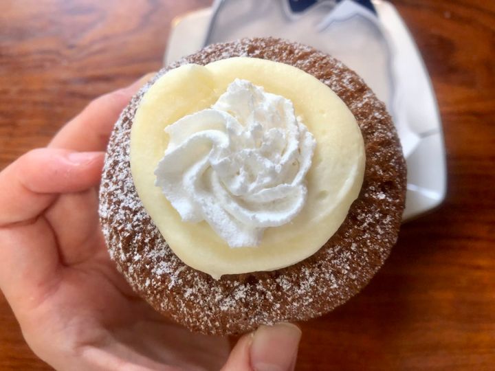 こちらのドーナツ♪チーズホイップと普通のホイップクリームが乗ったドーナツ。見た目もシンプルでかわいいですよね!私はクリームチーズの味が大好きなので、これは絶対に食べたかった。