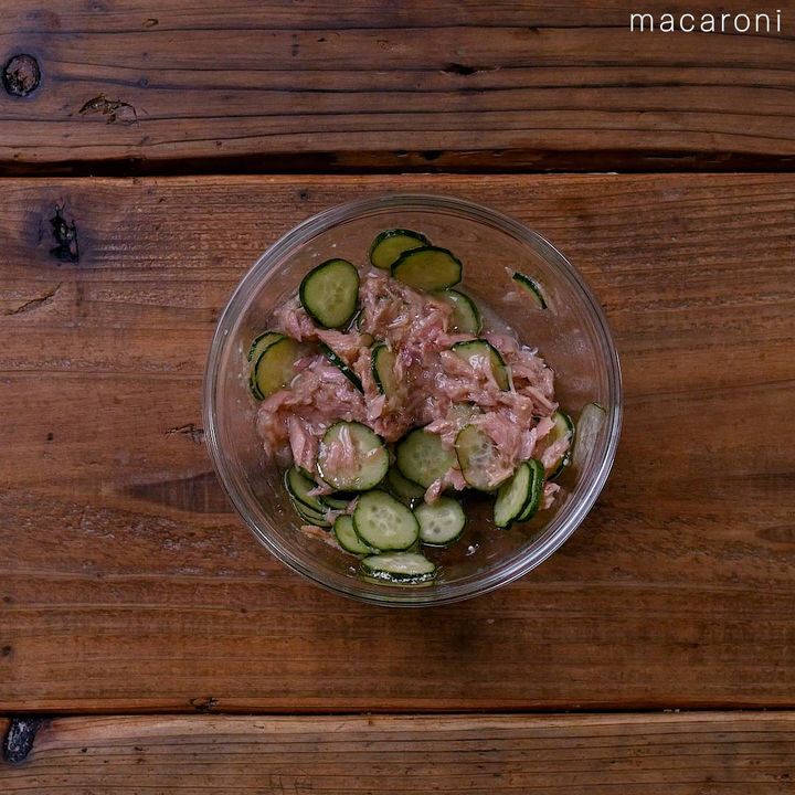3: ボウルにきゅうり、ツナ缶を汁ごと加え、鶏ガラスープの素を加えて混ぜ合わせます。