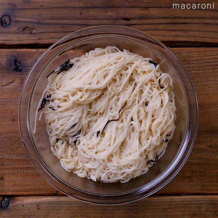 4: そうめんにめんつゆ、ごま油、塩こんぶを加えてよく混ぜ合わせます。