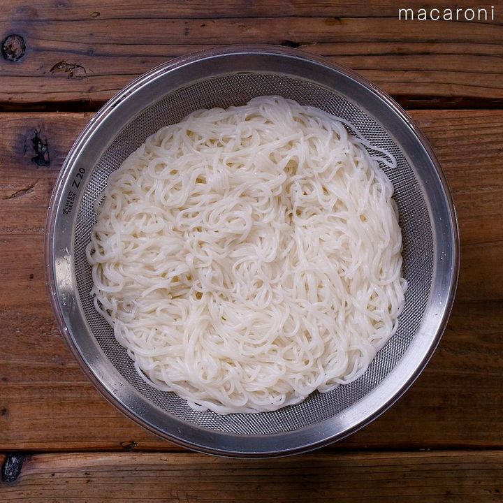 1: 鍋に湯を沸かし、そうめんを袋の表記通りにゆでます。氷水でぬめりを落とすように洗って冷やします。