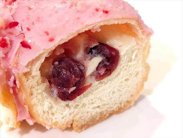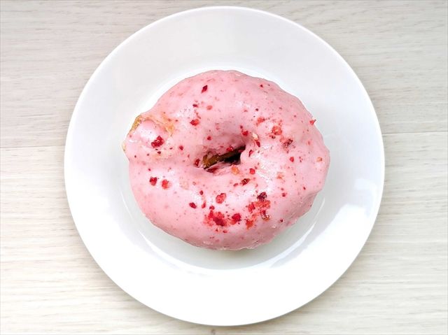 No.2は「イチゴミルクチョコ」! 生地にいちごジャム・ホワイトチョコレート・クランベリー・練乳が包まれています。いちごチョコとドライいちごでコーティングされた、鮮やかなピンク色が可愛いドーナツです。