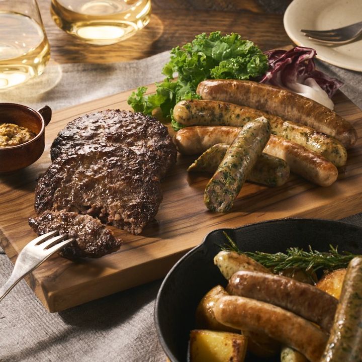 猪ハンバーグとソーセージ4種のセット。肉の旨み、ボリューミーな味わいを楽しむことができます。農場で採れたほうれん草やハーブを肉と組み合わせたソーセージは、猪肉の旨味がつまった濃厚な味わいに、畑でとれた野菜の爽やかさと甘さが加わった、他にはないおいしさ。