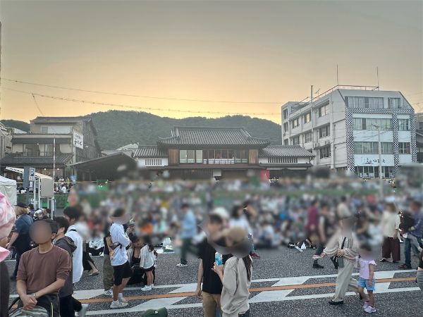 有料観覧席周辺の様子です。歩行者天国になった17時以降は鞆の浦一帯に人があふれてきました。花火の打ち上げ前には鞆の浦の伝統芸能の「アイヤ節」が披露され花火大会を一層盛り上げてくれます。