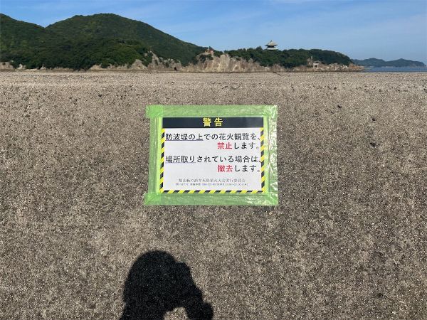 弁天島花火大会では場所取りは禁止されています。立って待っている時には 注意されませんでしたが、防波堤にも注意書きが貼ってあるので座り込むのは要注意。