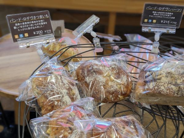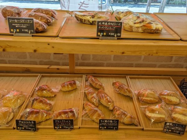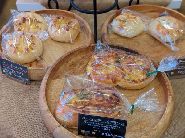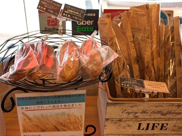 この日はお昼頃にお伺いしたのですが、既に下げられたプライスカードも多数。それでもまだ多くの種類がありましたので、紹介させていただきますね。 熊本県で育てられた小麦粉と米を使用している、ハード系のパン。初めて行くパン屋さんでは、まずバゲットを食べてみることが多いのですが、名水処で育った小麦粉であることが納得の、深い味わいで大満足♪柔らかめで日本人好みの食感でしたよ。