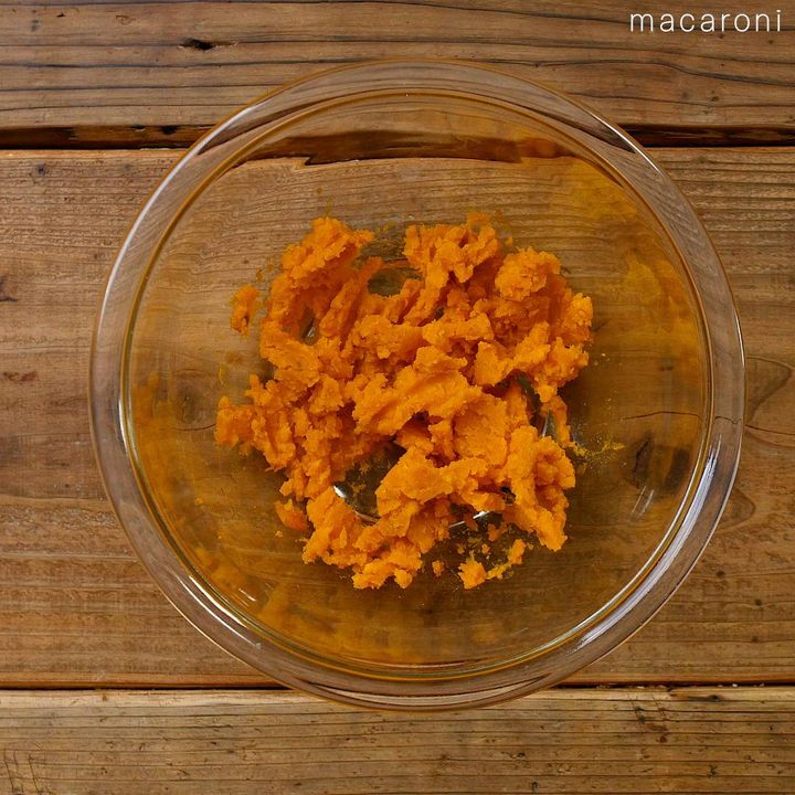 2: かぼちゃがあたたかいうちにマッシャーで潰し、粗熱を取ります。