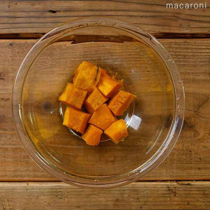 1: かぼちゃを耐熱ボウルに入れてラップをかけ、レンジ600Wで5分加熱します。