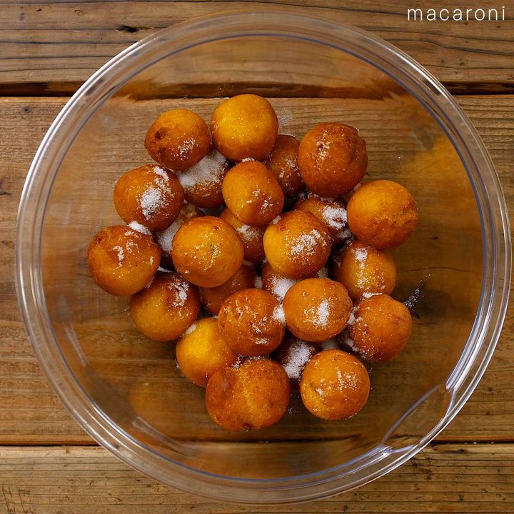 5: 170℃に熱した油で2〜3分転がしながら揚げます。揚げたてにグラニュー糖をまぶして完成です。