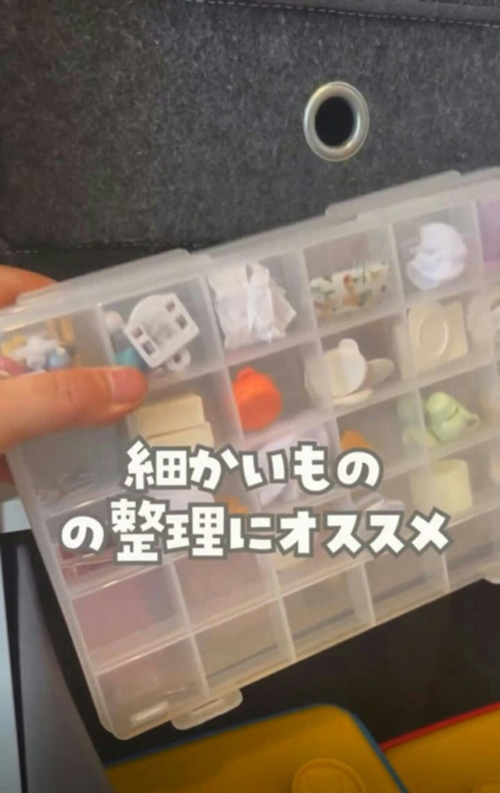 小さい仕切りのあるタイプは、混ざってしまうと混乱してしまう細かい部品の整理に適しています。前述したシルバニアファミリーなどのおもちゃの他に、アクアビーズやナノブロックの収納にも役立ちます。