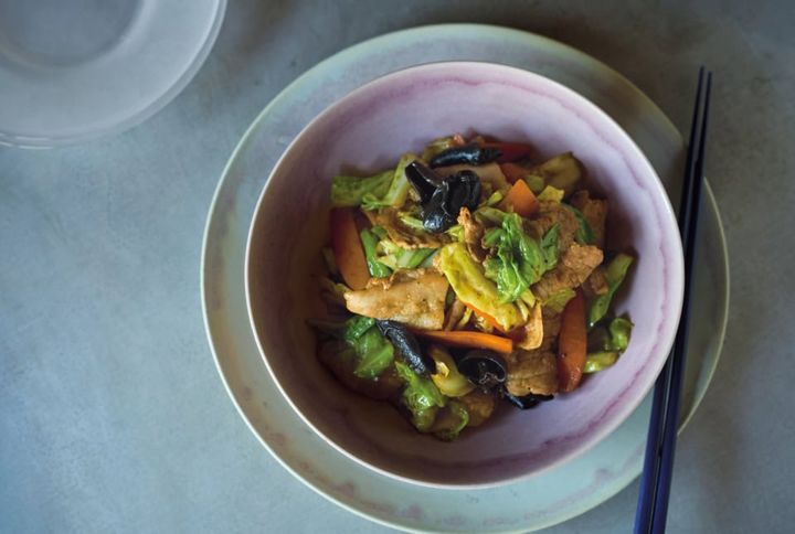 きくらげは水に浸して15分ほどおいてもどし、水気をきる。キャベツは3〜4㎝大に切り、にんじんは短冊切りにする。豚肉は長さ3〜4㎝に切る。