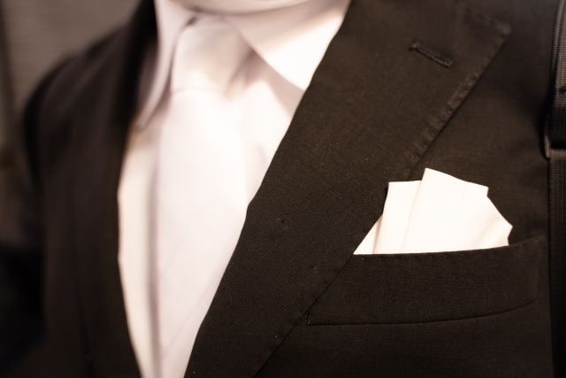 スーツのフォーマル感をより高めたい場合は、ポケットチーフが使えます。