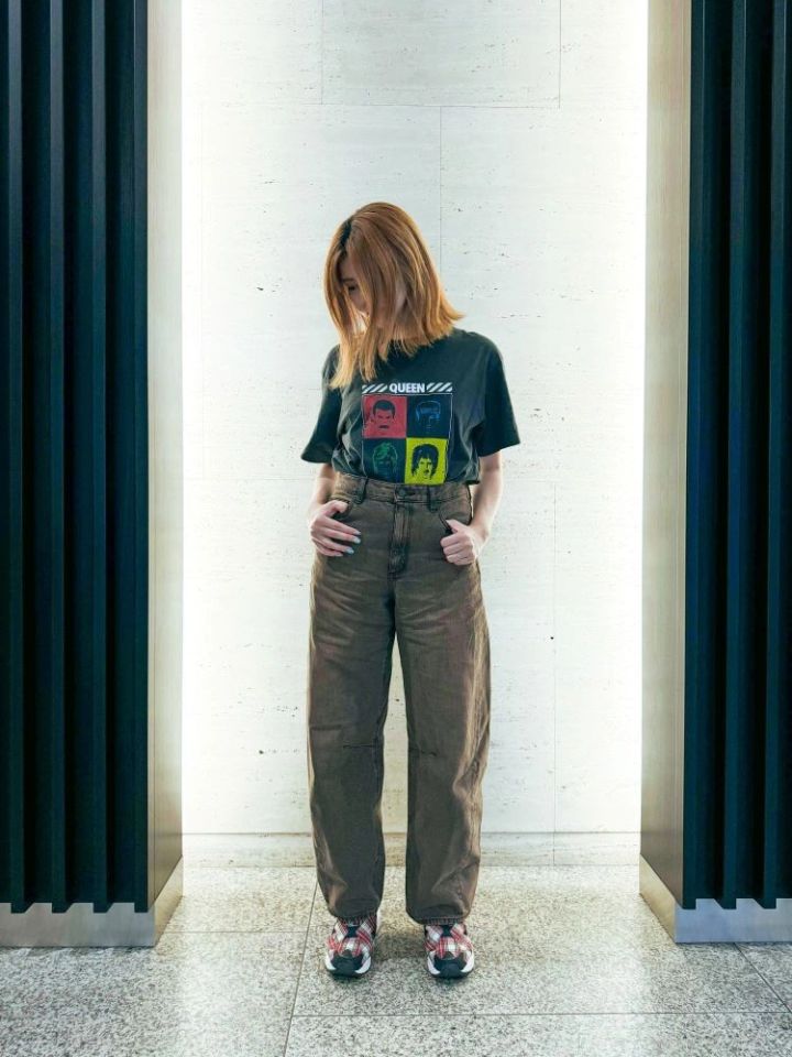 梅とまとは敬愛するQUEENのTシャツをウエストイン。脚長効果抜群です。グレー地のトップスにヴィンテージ加工のブラウンが絶妙にマッチ。