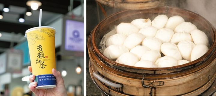 左・第二市場をゆく人々の公式ドリンク的存在『老頼紅茶』の老頼紅茶(アイスティー)30元。