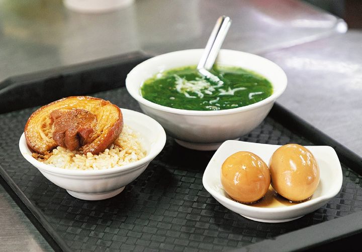 『山河魯肉飯』の魯肉飯65元、台中名産の黄麻(モロヘイヤ)を刻んで作る夏限定スープ「※(草冠+麻)※(草冠+意)湯」50元、トッピングの煮玉子「魯蛋」20元。