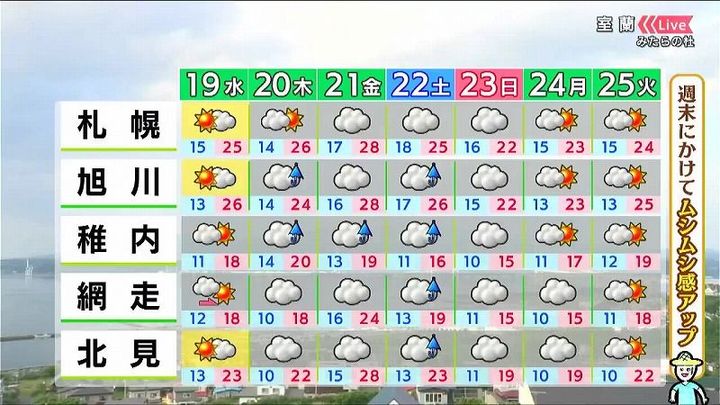 道南方面は日差しが出ますが、道東は曇り空が続き、木曜日以降はにわか雨に注意してください。気温は高めで、蒸し暑い日が多くなるでしょう。