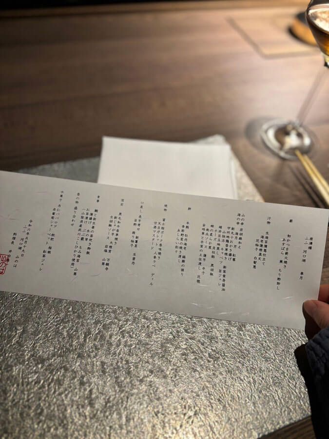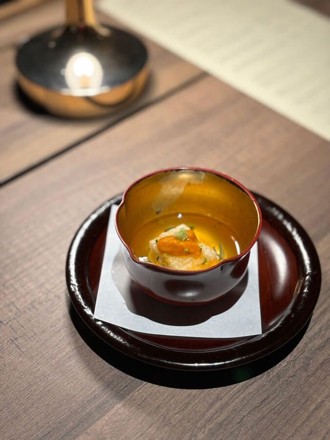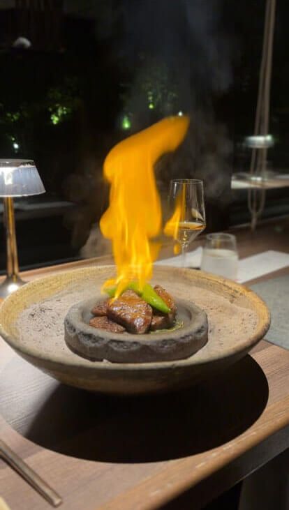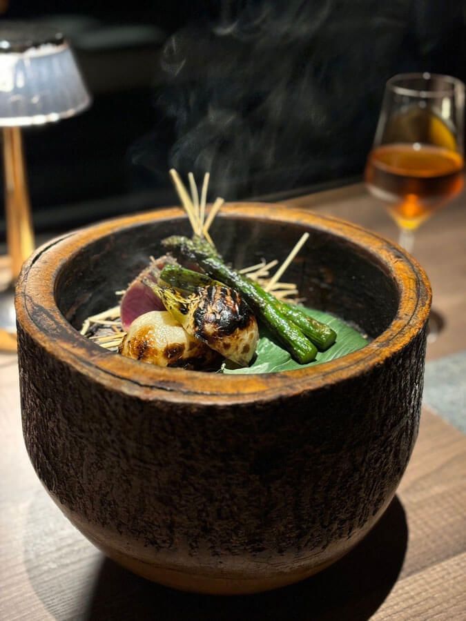 溶岩石や薪の香りとともに、ここでしか味わうことのできない日本料理を楽しみました。お料理は細かいところまで工夫されており、見ても食べても楽しく、最後まで飽きずに特別な食事の時間を楽しむことができました。お食事とお酒のペアリングを楽しむこともでき、大人の贅沢を味わえます。
